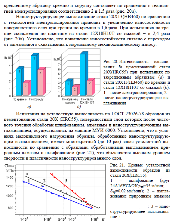 Установлено, что в условиях малоциклового нагружения образцы, обработанные наноструктурирующим выглаживанием, имеют многократный запас усталостной прочности по сравнению с образцами, обработанными обычным выглаживанием и шлифованием, что объясняется формированием в тонком поверхностном слое до 10 мкм нанокристаллических структур и созданием высокого уровня прочности и пластичности поверхностного слоя.