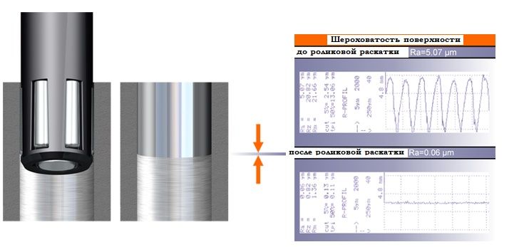 При роликовом обкатывании поверхность за короткое время упрочняется, при этом улучшается шероховатость поверхности, а за счет сжимающих остаточных напряжений увеличивается срок службы детали. Изменение диаметра заготовки происходит только на размер вдавливаний роликов в поверхность детали. Для обеспечения требуемых допусков на обработку важно сохранять припуск перед процессом обработки с учетом изменения диаметра. Точность предшествующего процесса обработки непосредственно влияет на размер после обработки обкатыванием. Изменение диаметра зависит от материала, твердости и роликов. Следует провести 2-3 экспериментальных прохода для получения наилучших параметров обработки перед потоковой обработкой партии деталей.