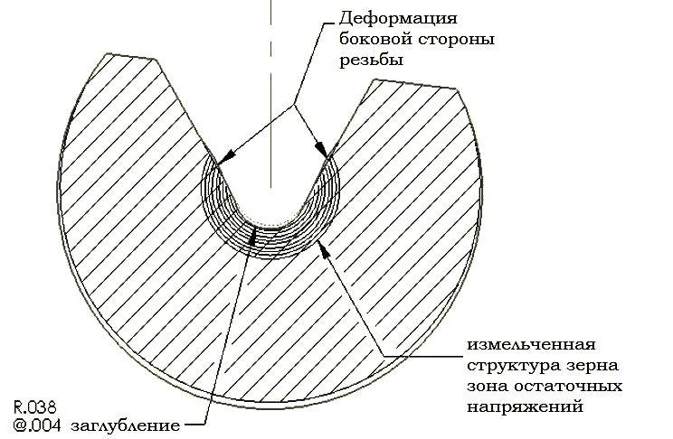 Такая деформация обеспечивает холодную обработку материала, улучшая качество поверхности, уплотняя и вытесняя зерна материала в корне резьбы.