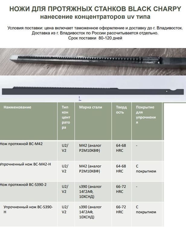 Стандартные протяжные ножи применяются для обработки образцов с твердостью не более 40 HRC. Для более твердых материалов, до 50 HRC, а также при больших объемах испытаний, рекомендуется использовать упрочненные ножи с покрытием из алюмонитрида титана (TiAlN). Они особенно эффективны при работе с износостойкими материалами, такими как нержавеющая сталь.